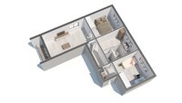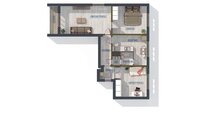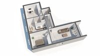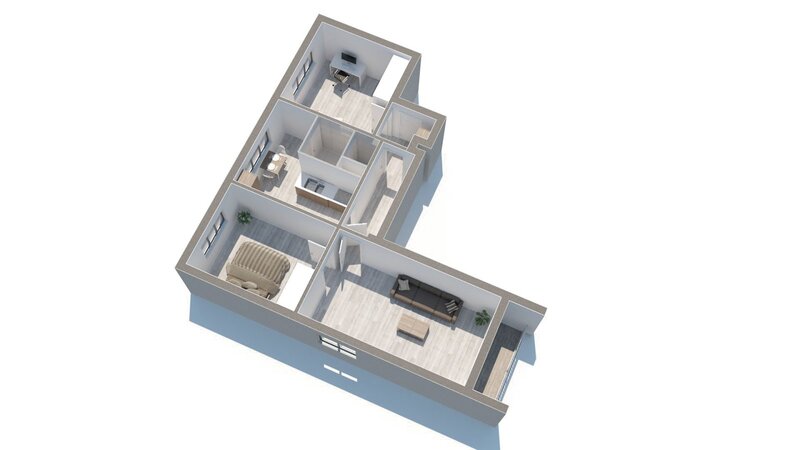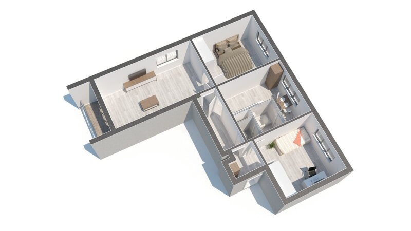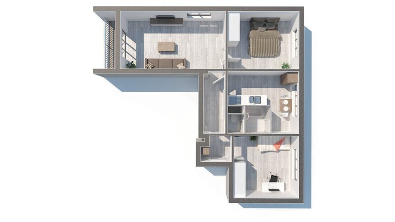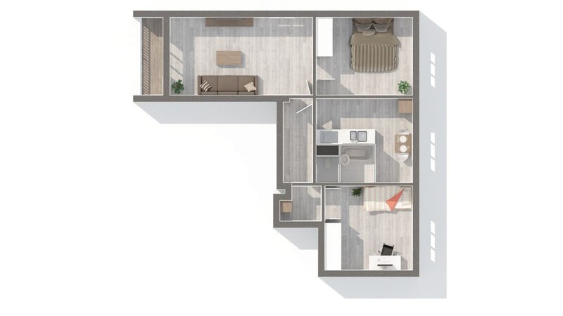 Byt tvoří tři samostatné pokoje a kuchyň s jídelním koutem. Jádro je