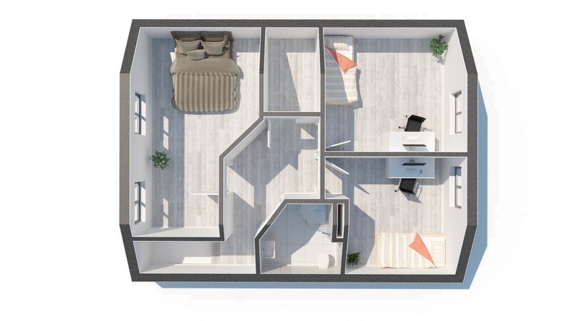 pokoje, ložnice a druhá koupelna se sprchovým koutem a toaletou.