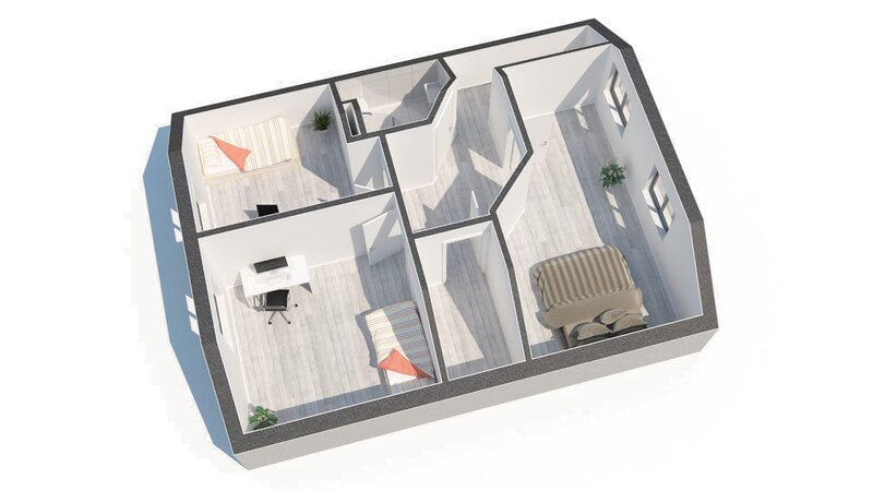 dvou plnohodnotných obytných podlaží a menšího sklepa.
